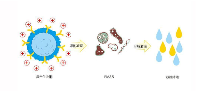 具体来说,在PM2.5治理方面,生物酶PM2.5治理产品中的活性高分子成分带有正电荷,具有强力的吸附凝聚功效,使空气中的固体小颗粒团聚与产品中的液体凝聚成小液滴降落,从而净化空气,适用于城市大气环境PM2.5污染治理、工业园区及周边开放环境PM2.5污染治理以及工业环境厂房、车间内部的PM2.5污染治理。