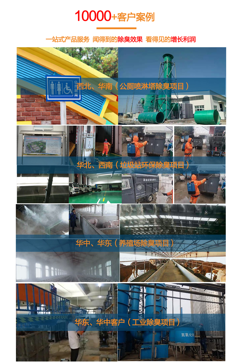 使用方法:根据异味浓度兑水稀释50-500倍,结合雾化或喷淋设备直接喷雾使用;